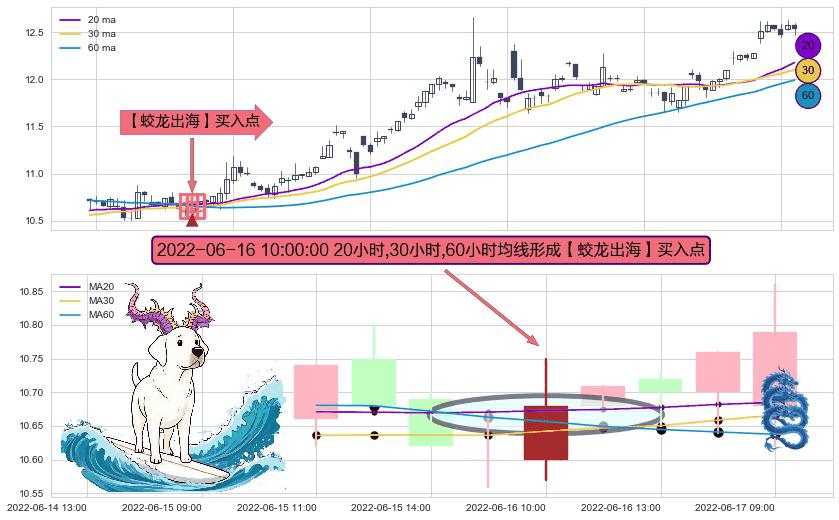 形态多维评估: ⚀ 2022-06-16 10:00:00小时显现 20小时-30小时-60小时均线 【蛟龙出海】买入点 看多信号,后市看涨,买入