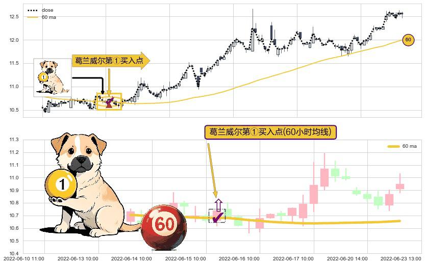 形态多维评估: ⚀ 2022-06-15 11:00:00-小时显现 葛兰威尔均线 60小时均线 第买①入点 走势反转见底信号,后市看涨,买进信号