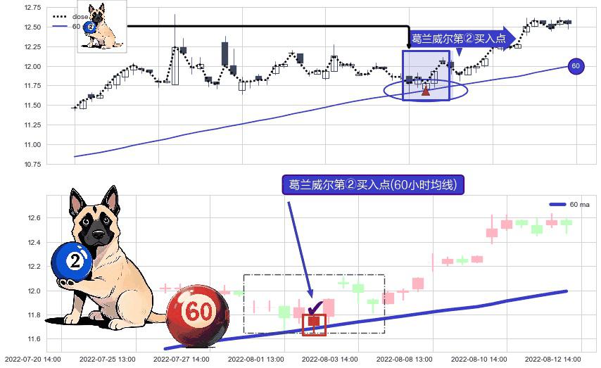 形态多维评估: ⚀ 2022-08-02 13:00:00-小时显现 葛兰威尔均线 60小时均线 第②买入点 上升趋势的中继信号,后市看涨,买进信号