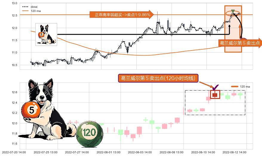 形态多维评估: ⚀ 2022-08-10 14:00:00-小时显现 葛兰威尔均线 120小时均线 第⑤卖出点 上升趋势均值回复的短线回落信号,后市看跌,卖出信号