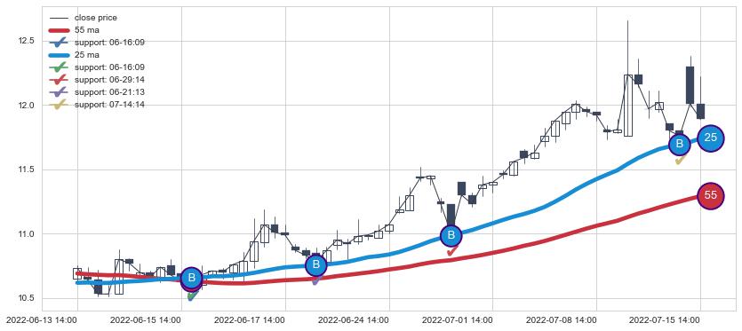 上涨趋势06-13 14:00-07-15 14:00,均线25, 55确认关键支撑4处