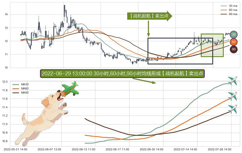 形态多维评估: ⚀ 2022-06-10 11:00:00小时-2022-07-28 13:00:00小时显现 30小时-60小时-90小时均线 【战机起航】卖出点 看空信号,后市看跌,卖出