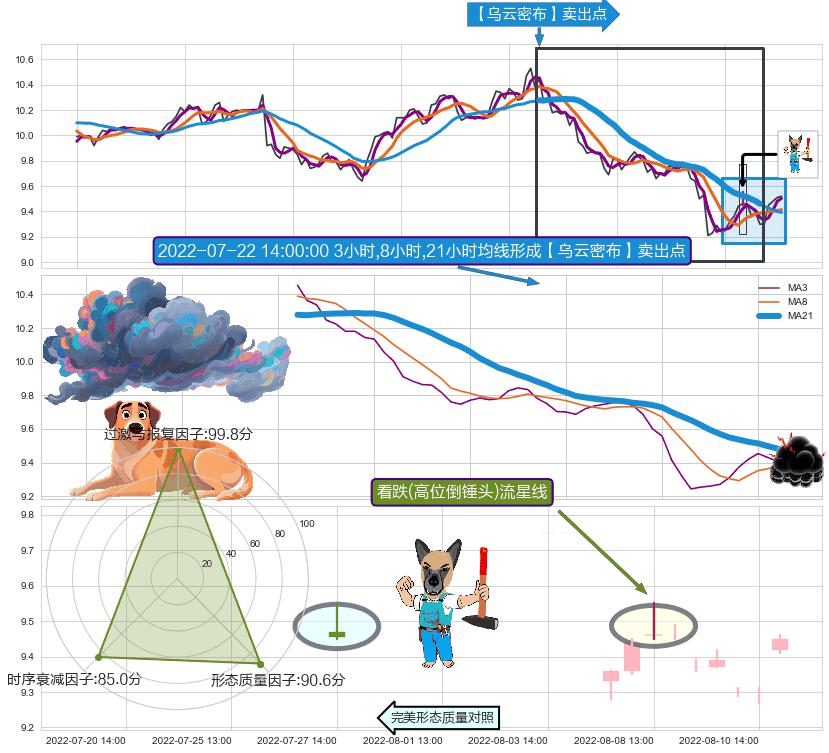 从2022-07-04 14:00至2022-08-12 13:00,共包含58个小时,阶段股价下跌-9.98%,阶段股价变动位移路程比: 1 : 3,下跌趋势角度: 41.4,2022-08-02 13:00向↘︎形成缺口,跳空下跌-3.36%˚