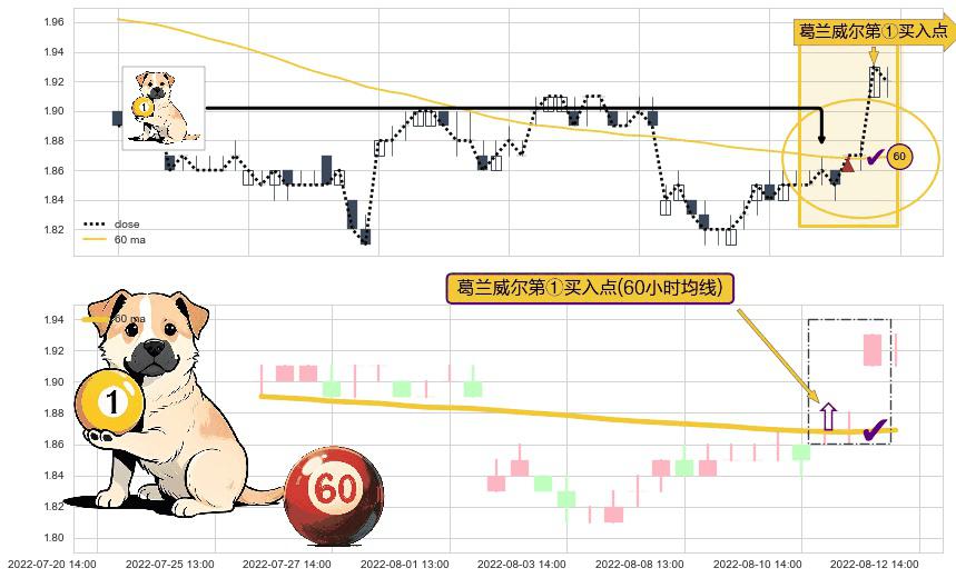 ⚀ 2022-08-11 13:00:00-小时显现 葛兰威尔均线 60小时均线 第买①入点 走势反转见底信号,后市看涨,买进信号