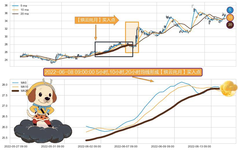 形态多维评估: ⚀ 2022-06-01 10:00:00小时-2022-06-13 14:00:00小时显现 5小时-10小时-20小时均线 【烘云托月】买入点 看多信号,后市看涨,买入