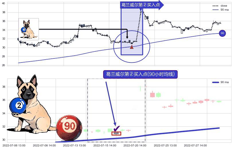 形态多维评估: ⚀ 2022-07-15 14:00:00-小时显现 葛兰威尔均线 90小时均线 第②买入点 上升趋势的中继信号,后市看涨,买进信号