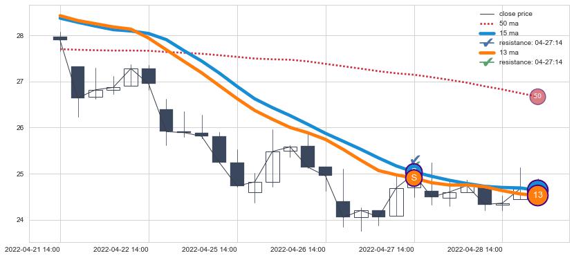 下跌趋势02-14 13:00-03-30 14:00,均线50确认关键阻力2处