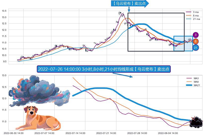⚀ 2022-07-12 14:00:00小时-2022-08-09 13:00:00小时显现 3小时-8小时-21小时均线 【乌云密布】卖出点 看空信号,后市看跌,卖出