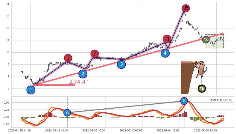从2022-04-26 09:00至2022-07-15 14:00,共包含216个小时,阶段股价上涨51.99%,阶段股价变动位移路程比: 1 : 3,上涨趋势角度: 34.4
