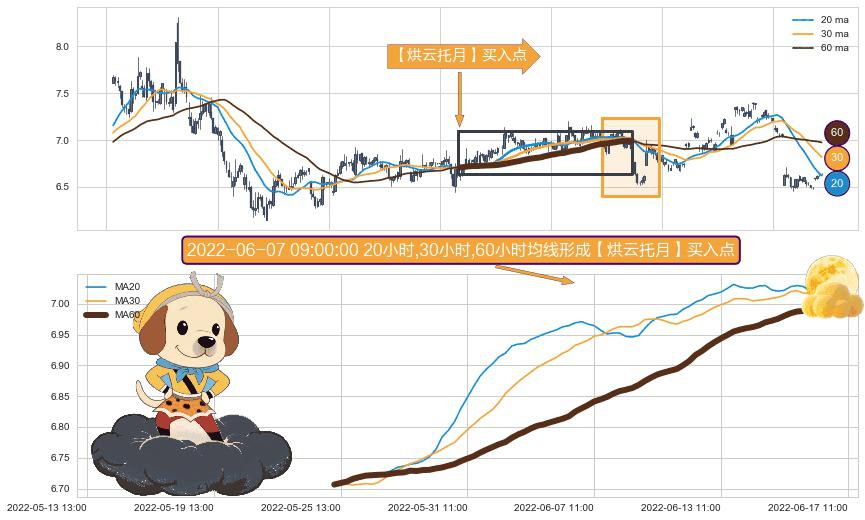 形态多维评估: ⚀ 2022-05-25 11:00:00小时-2022-06-16 13:00:00小时显现 20小时-30小时-60小时均线 【烘云托月】买入点 看多信号,后市看涨,买入