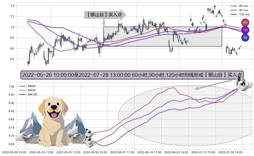 形态多维评估: ⚀ 2022-05-26 11:00:00-小时至2022-07-28 13:00:00-小时显现 60小时-90小时-120小时均线 【银山谷】买入点 看多信号,后市看涨,买入