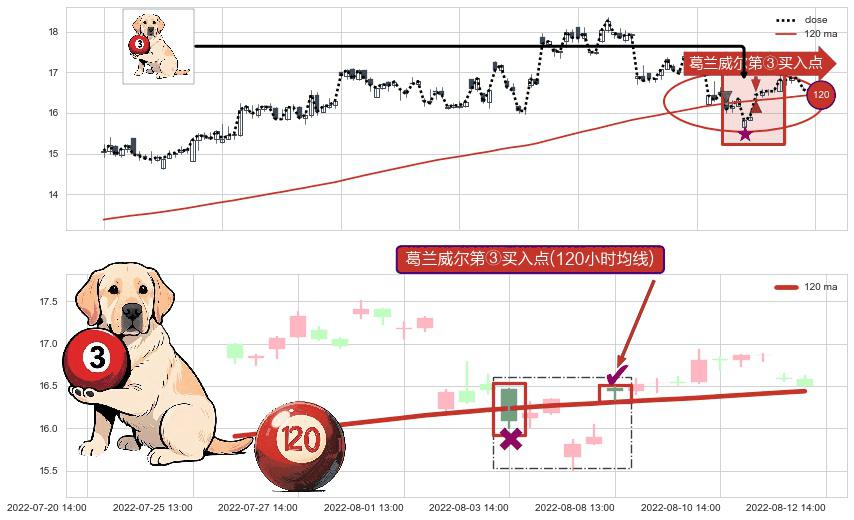 形态多维评估: ⚀ 2022-08-08 13:00:00-小时显现 葛兰威尔均线 120小时均线 第③买入点 上升趋势的中继信号,后市看涨,买进信号