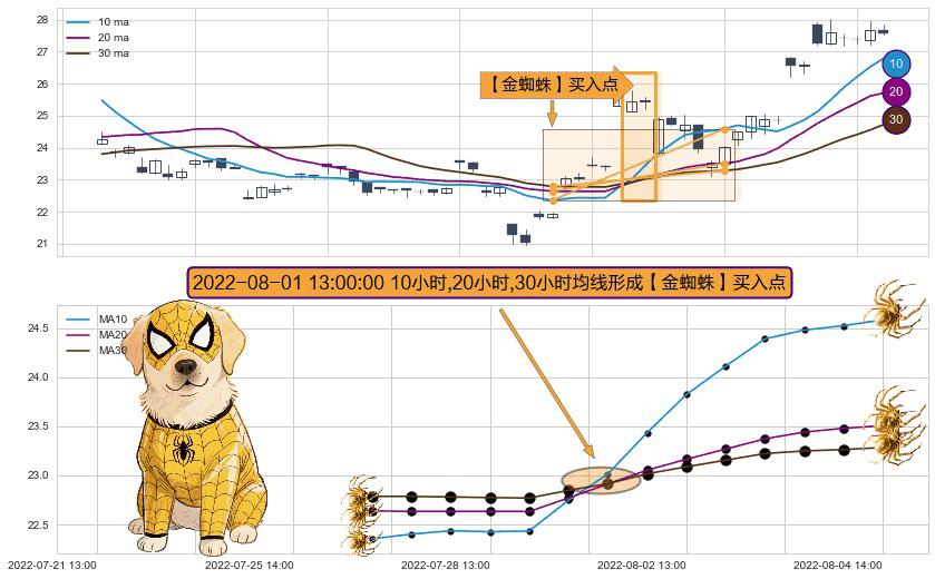 形态多维评估: ⚀ 2022-08-01 13:00:00小时显现 10小时-20小时-30小时均线 【金蜘蛛】买入点 看多信号,后市看涨,买入