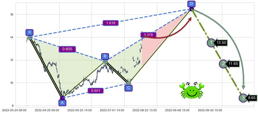 ➢ 距离预测D点位置尚有上涨空间,短线依然【看涨】, 耐心等待看跌【螃蟹】形态反转启动