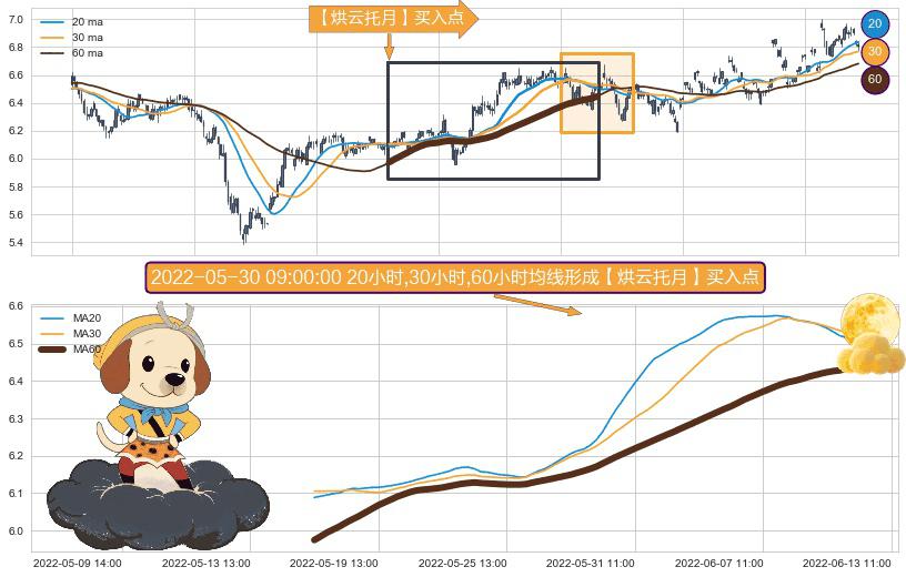 形态多维评估: ⚀ 2022-05-17 13:00:00小时-2022-06-10 11:00:00小时显现 20小时-30小时-60小时均线 【烘云托月】买入点 看多信号,后市看涨,买入