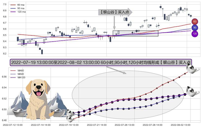 形态多维评估: ⚀ 2022-07-19 14:00:00-小时至2022-08-02 13:00:00-小时显现 60小时-90小时-120小时均线 【银山谷】买入点 看多信号,后市看涨,买入
