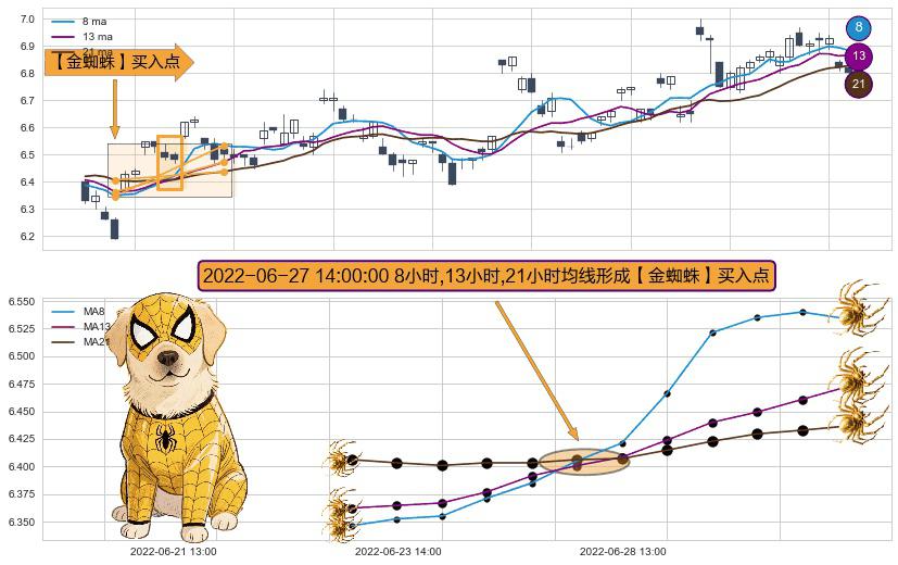 形态多维评估: ⚀ 2022-06-27 14:00:00小时显现 8小时-13小时-21小时均线 【金蜘蛛】买入点 看多信号,后市看涨,买入