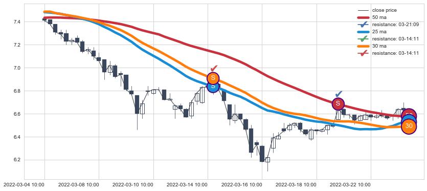下跌趋势03-04 10:00-03-23 11:00,均线25, 50, 30确认关键阻力2处
