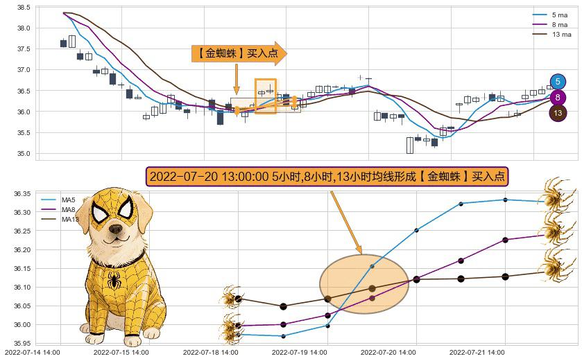 形态多维评估: ⚀ 2022-07-20 13:00:00小时显现 5小时-8小时-13小时均线 【金蜘蛛】买入点 看多信号,后市看涨,买入