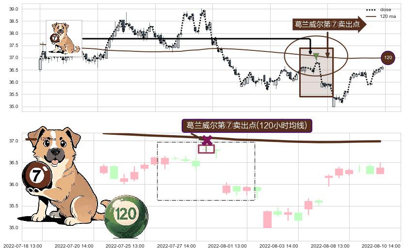 形态多维评估: ⚀ 2022-07-28 13:00:00-小时显现 葛兰威尔均线 120小时均线 第⑦卖出点 下降趋势的中继信号,后市看跌,卖出信号