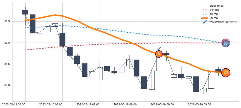 下跌趋势02-23 14:00-03-29 11:00,均线144, 55确认关键阻力4处