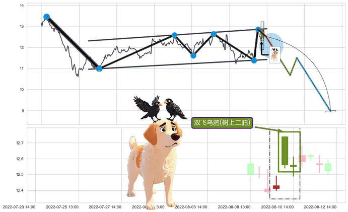 ➢ 🕰 价格走势在2022-08-09 14:00:00至2022-08-10 14:00:00期间形成双飞乌鸦(树上二鸦),残存影响值:-9.49