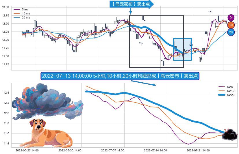 ⚀ 2022-07-01 13:00:00小时-2022-07-25 14:00:00小时显现 5小时-10小时-20小时均线 【乌云密布】卖出点 看空信号,后市看跌,卖出