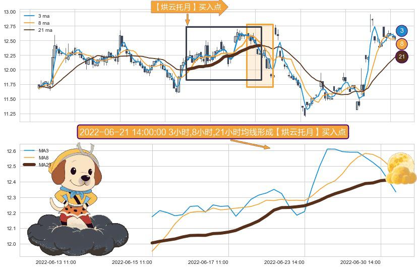 ⚀ 2022-06-15 11:00:00小时-2022-07-01 14:00:00小时显现 3小时-8小时-21小时均线 【烘云托月】买入点 看多信号,后市看涨,买入