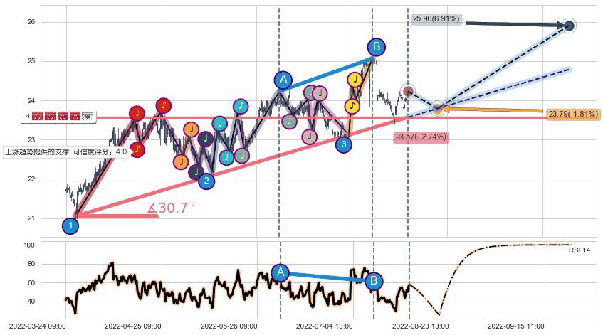 ♘ 阻力价格位25.07,可信任强度55.63%,距离最后交易2022-08-12 14:00形成的收盘价格24.23相差 +3.47%