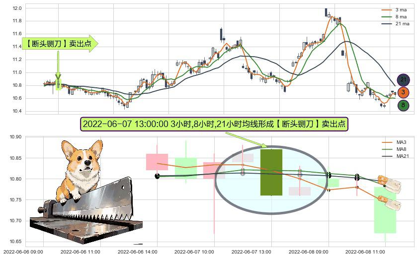 ⚀ 2022-06-07 13:00:00小时显现 3小时-8小时-21小时均线 【断头铡刀】卖出点 看空信号,后市看跌,卖出