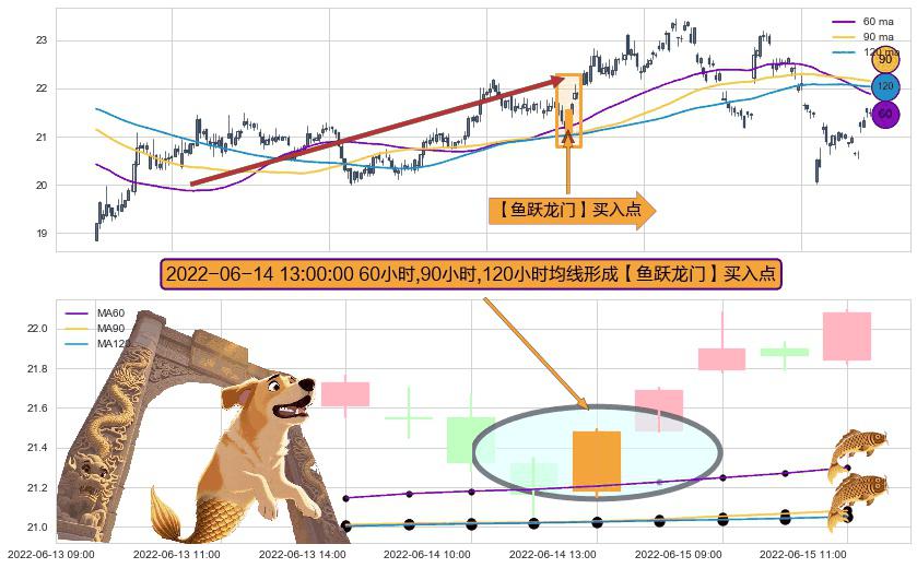 ⚀ 2022-06-14 13:00:00小时显现 60小时-90小时-120小时均线 【鱼跃龙门】买入点 看多信号,后市看涨,买入