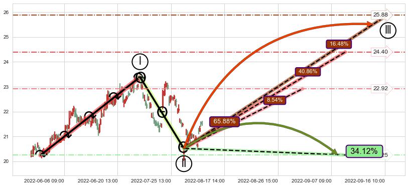 ➣ 2022-05-24 14:00-2022-07-07 13:00上升趋势存在反转[风险],其原上升趋势的支撑位(22.79)已破位[强阻力信号],原上升趋势角度: 39.0˚