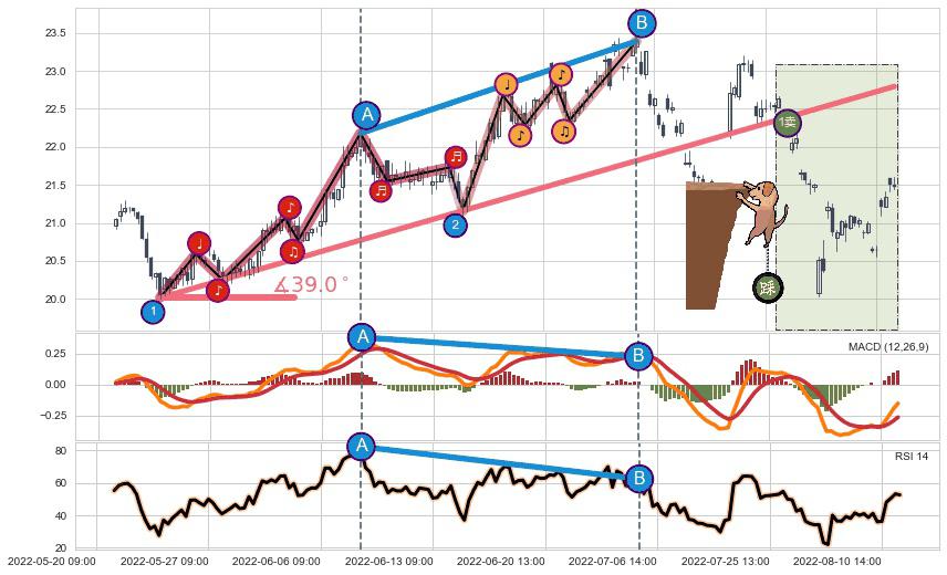 从2022-07-20 14:00至2022-08-02 14:00,共包含19个小时,阶段股价下跌-12.40%,阶段股价变动位移路程比: 1 : 1.2,2022-08-02 13:00向↘︎形成缺口,跳空下跌-4.60%˚