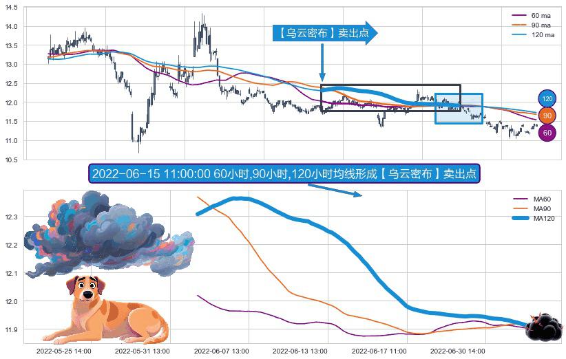 ⚀ 2022-06-02 09:00:00小时-2022-07-11 13:00:00小时显现 60小时-90小时-120小时均线 【乌云密布】卖出点 看空信号,后市看跌,卖出