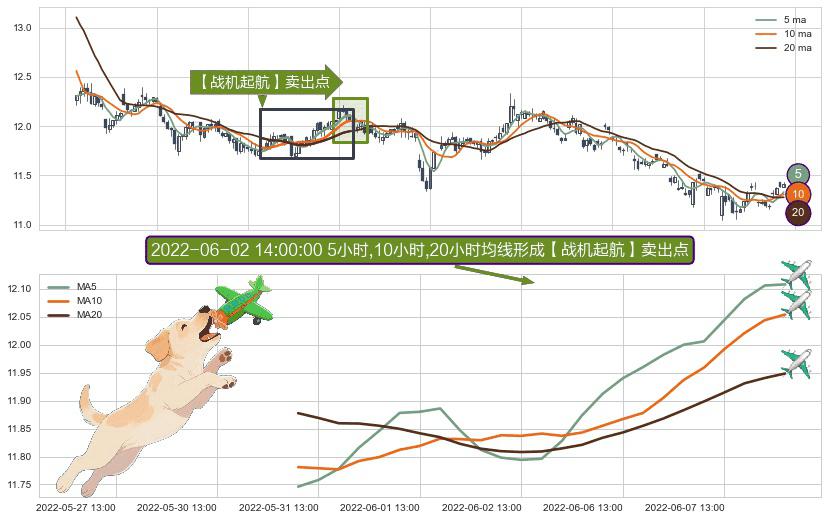 ⚀ 2022-05-31 11:00:00小时-2022-06-08 10:00:00小时显现 5小时-10小时-20小时均线 【战机起航】卖出点 看空信号,后市看跌,卖出