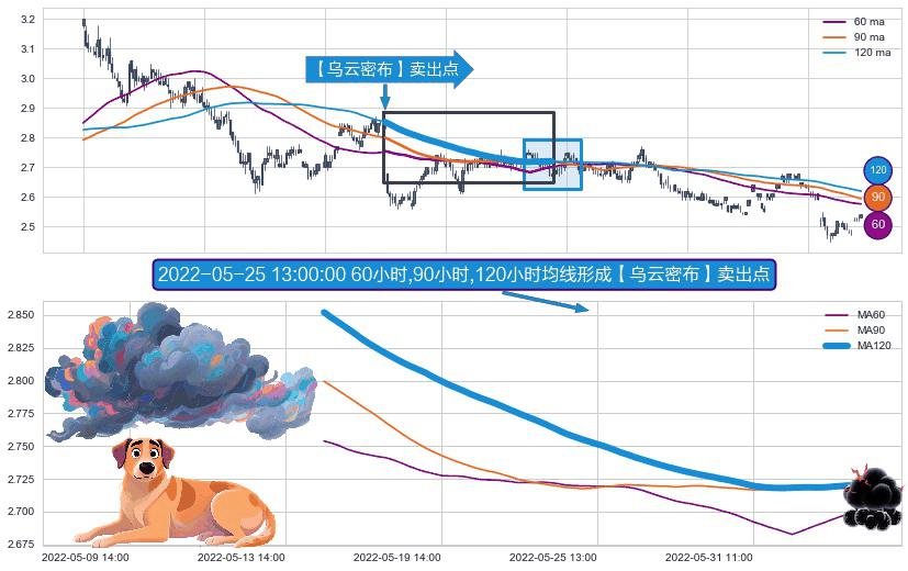 形态多维评估: ⚀ 2022-05-16 14:00:00小时-2022-06-06 10:00:00小时显现 60小时-90小时-120小时均线 【乌云密布】卖出点 看空信号,后市看跌,卖出
