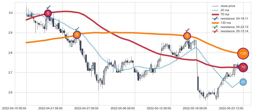 下跌趋势04-15 09:00-05-23 13:00,均线130, 70确认关键阻力3处
