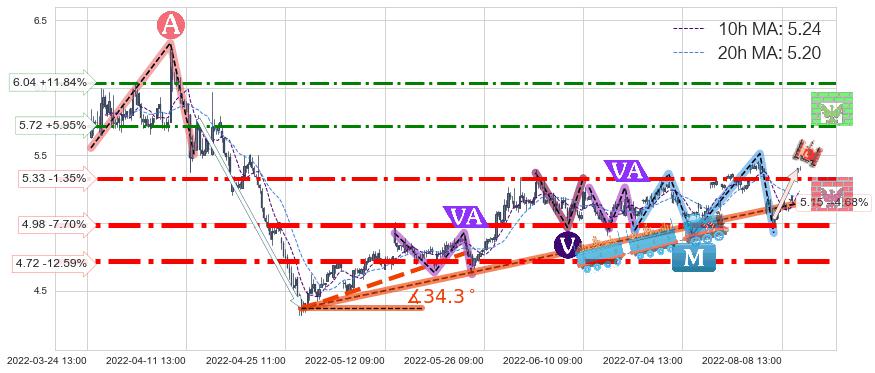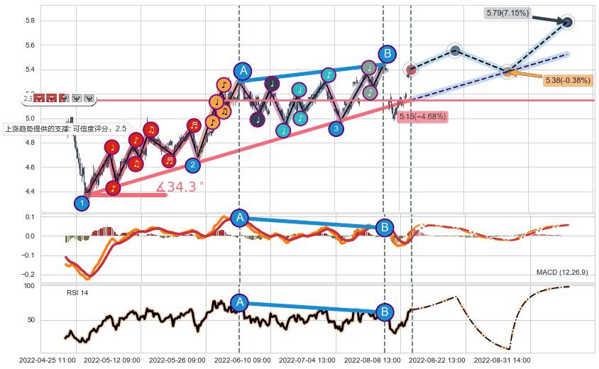 ➣ 预测:2022-08-29 12:00,【小幅回撤】稳定目前上涨趋势的前提下,预测价格:5.38