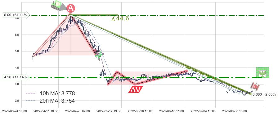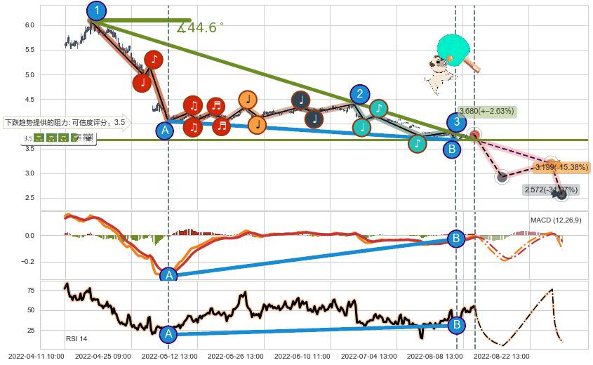 🦴 长线均值回复组合短线趋势跟踪[强阻力信号]2022-04-15 09:00-2022-08-12 13:00下跌趋势依然成立(下跌趋势跟踪依然存在),短线价格略微上行反弹(均值回复猜想),即将接近下跌趋势提供的未破位阻力价格:3.680。