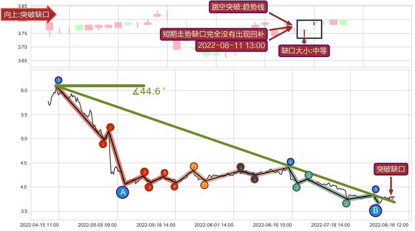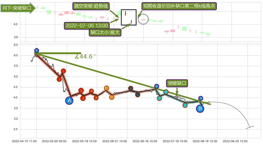 从2022-04-15 09:00至2022-08-12 13:00,共包含290个小时,阶段股价下跌-45.02%,阶段股价变动位移路程比: 1 : 4,下跌趋势角度: 44.6,2022-04-28 09:00向↘︎形成缺口,跳空下跌-9.90%˚
