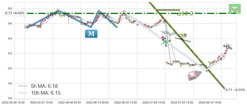♘ 阻力价格位6.73,可信任强度73.23%,距离最后交易2022-08-12 14:00形成的收盘价格6.21相差 +8.43%