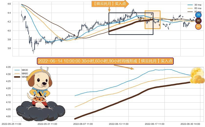 ⚀ 2022-06-02 11:00:00小时-2022-06-29 13:00:00小时显现 30小时-60小时-90小时均线 【烘云托月】买入点 看多信号,后市看涨,买入