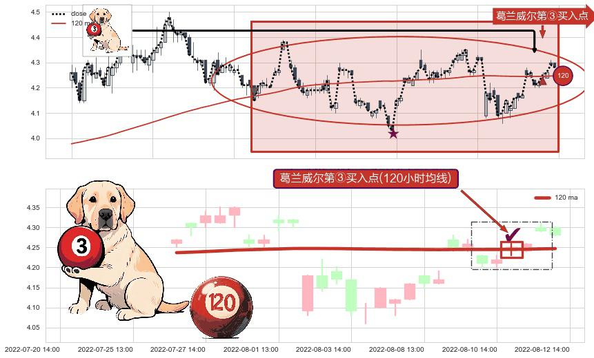 ⚀ 2022-08-11 13:00:00-小时显现 葛兰威尔均线 120小时均线 第③买入点 上升趋势的中继信号,后市看涨,买进信号