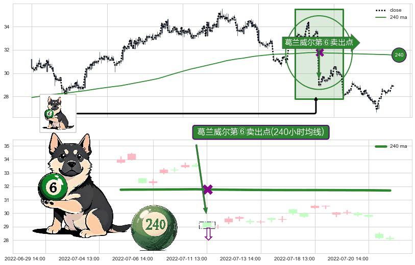 ⚀ 2022-07-11 13:00:00-小时显现 葛兰威尔均线 240小时均线 第⑥卖出点 走势反转见顶信号,后市看跌,卖出信号