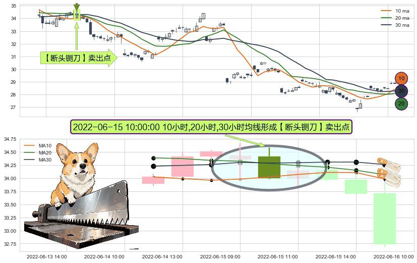 ⚀ 2022-06-15 10:00:00小时显现 10小时-20小时-30小时均线 【断头铡刀】卖出点 看空信号,后市看跌,卖出