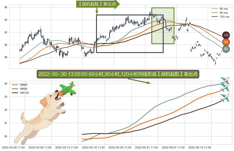 ⚀ 2022-05-16 09:00:00小时-2022-06-15 09:00:00小时显现 60小时-90小时-120小时均线 【战机起航】卖出点 看空信号,后市看跌,卖出