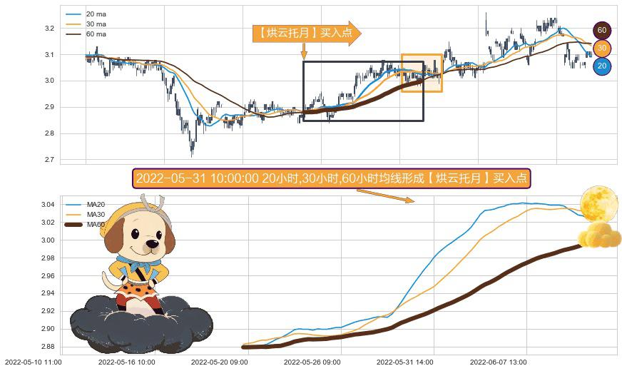 ⚀ 2022-05-19 14:00:00小时-2022-06-10 10:00:00小时显现 20小时-30小时-60小时均线 【烘云托月】买入点 看多信号,后市看涨,买入