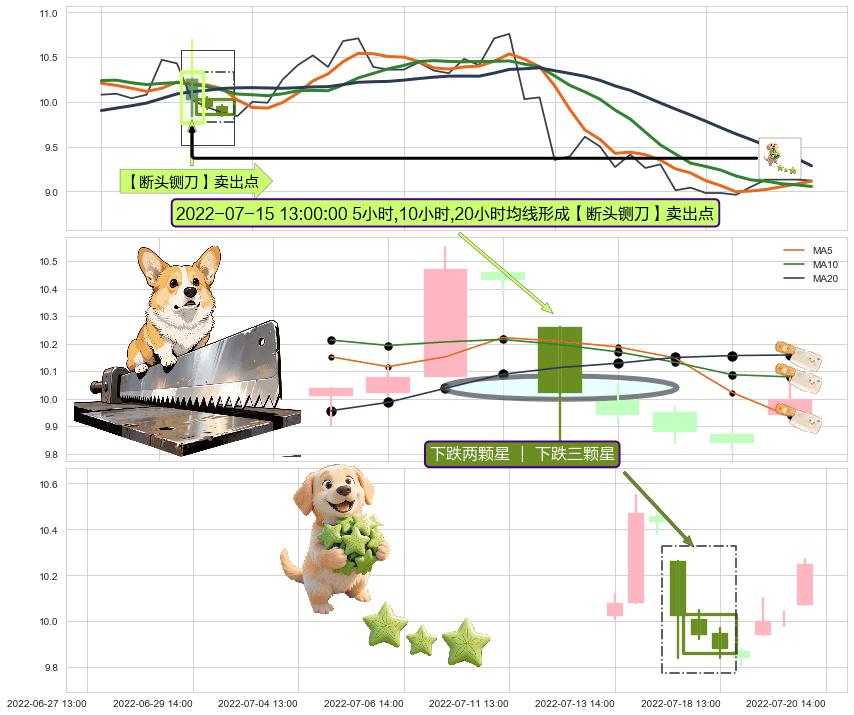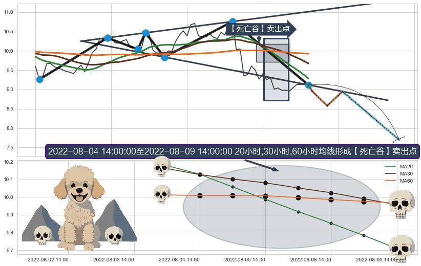 从2022-07-29 14:00至2022-08-12 14:00,共包含21个小时,阶段股价下跌-15.89%,阶段股价变动位移路程比: 1 : 1.9,2022-08-02 13:00向↘︎形成缺口,跳空下跌-6.96%˚