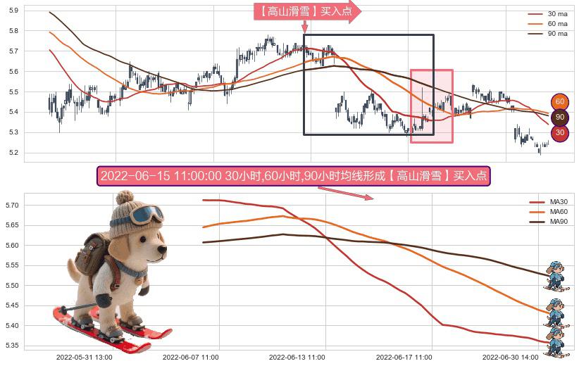 ⚀ 2022-06-06 14:00:00小时-2022-07-01 14:00:00小时显现 30小时-60小时-90小时均线 【高山滑雪】买入点 看多信号,后市看涨,买入