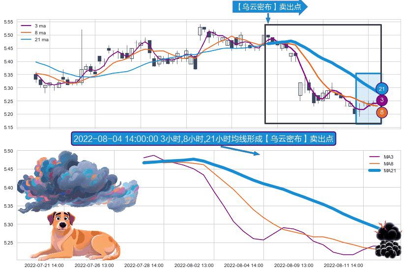 ⚀ 2022-07-27 14:00:00小时-2022-08-12 14:00:00小时显现 3小时-8小时-21小时均线 【乌云密布】卖出点 看空信号,后市看跌,卖出